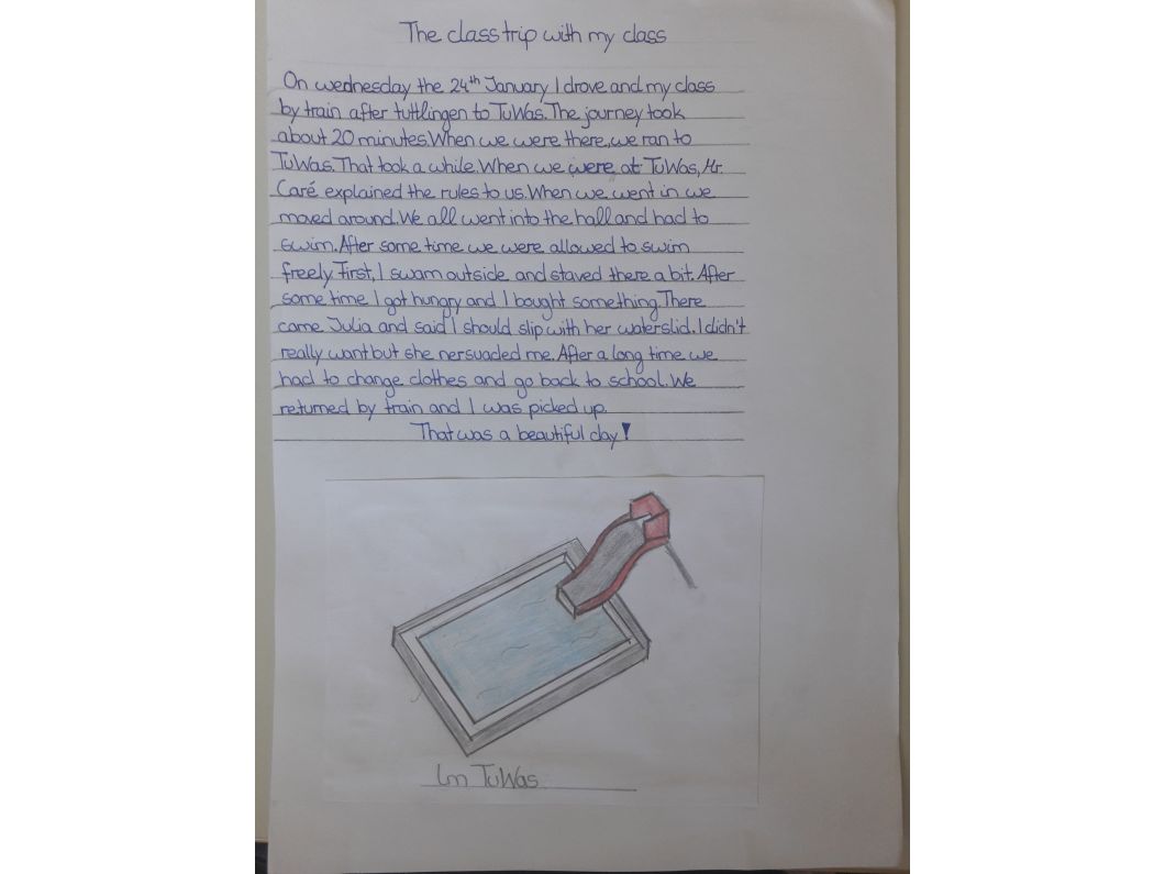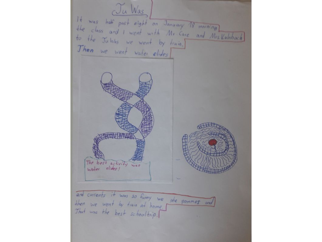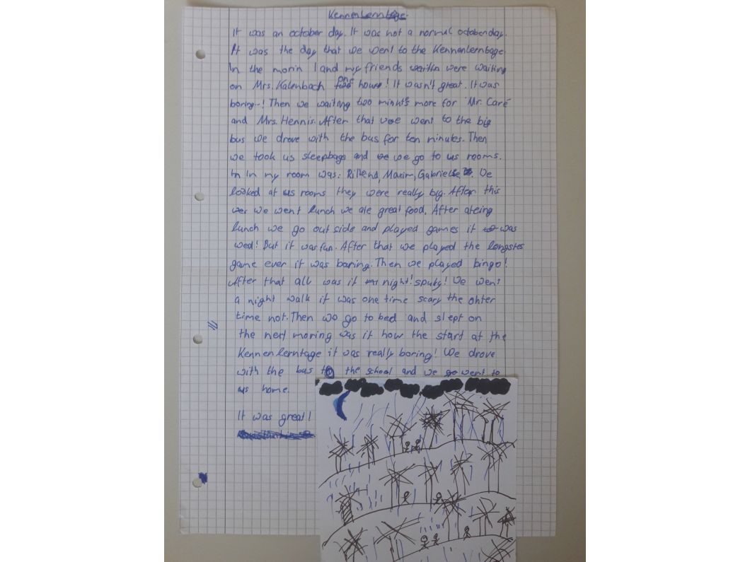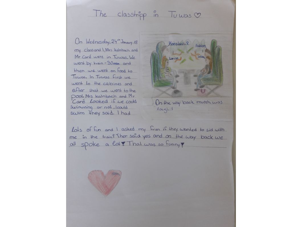 Gemeinsam beschäftigten sie sich zunächst mit einem ausführlichen Brainstorming. Sie sammelten in einer Mindmap zu einem Klassenausflug ihrer Wahl Erlebnisse, Emotionen und Erfahrungen. Diese ergänzten sie durch einen intensiven Austausch mit ihren Mitschülern. Anschließend gestalteten sie ein Bild, das das Erlebnis verdeutlicht und zum Schluss schrieben die SchülerInnen aus allen Informationen, die sie gesammelt hatten, zunächst ein „draft“ und nachfolgend einen Bericht. Ergbenisse können hier bertrachtet werden.