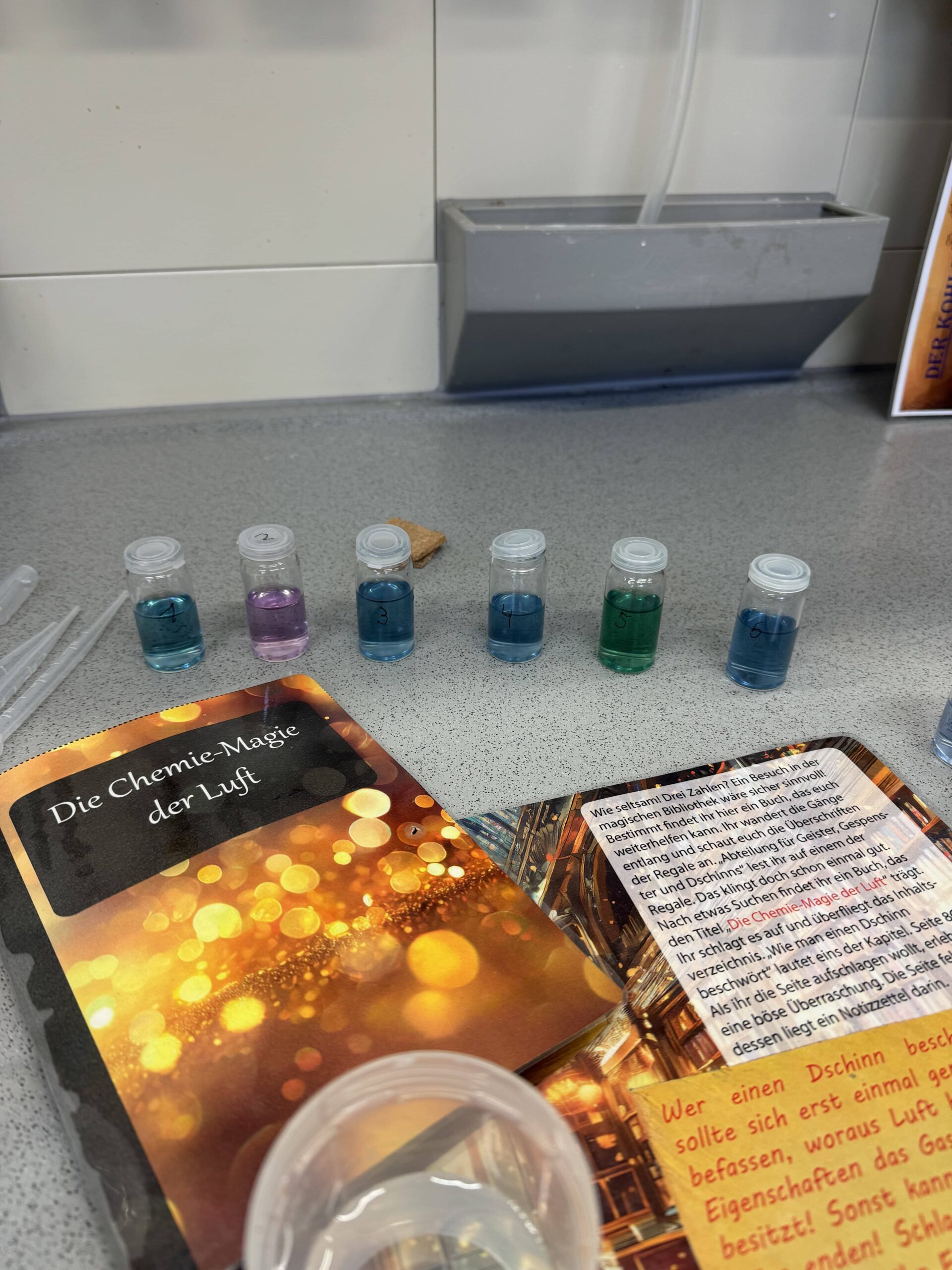 Die jungen Forscher arbeiteten begeistert mit verschiedenen Farben und lernten dabei den chemischen Hintergrund ihres Experiments kennen. Ein wichtiger Bestandteil war das Verständnis von Kohlenstoffdioxid und anderen chemischen Verbindungen, die sie für das Experiment benötigten. Mit großem Eifer setzten die Schülerinnen und Schüler die Anweisungen um und konnten so den sagenhaften „Dschinn“ tatsächlich aus der Flasche „befreien“ – ein beeindruckendes Ergebnis, das die Gruppe stolz machte.